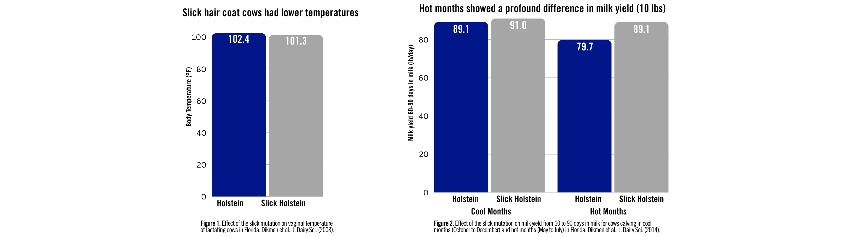 Research conducted by the University of Florida and the University of Puerto Rico supports the heat resistant abilities of Holsteins carrying the slick allele. By measuring vaginal temperatures in cows living in a freestall environment at the University of Florida, researchers found the cows with a slick hair coat averaged 1.1 degree Fahrenheit lower body temperatures at the hottest times of the day (noon to 3 p.m.) compared to the non-slick hair coat cows (Figure 1).