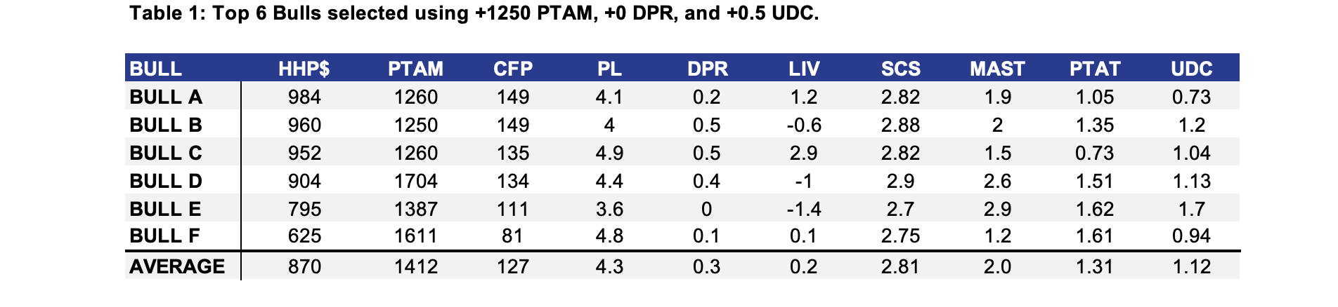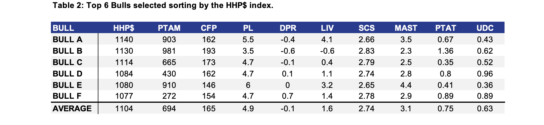Let’s assume HHP$ is the index that best aligns with the herd’s goals. The top six bulls for HHP$ are shown below.