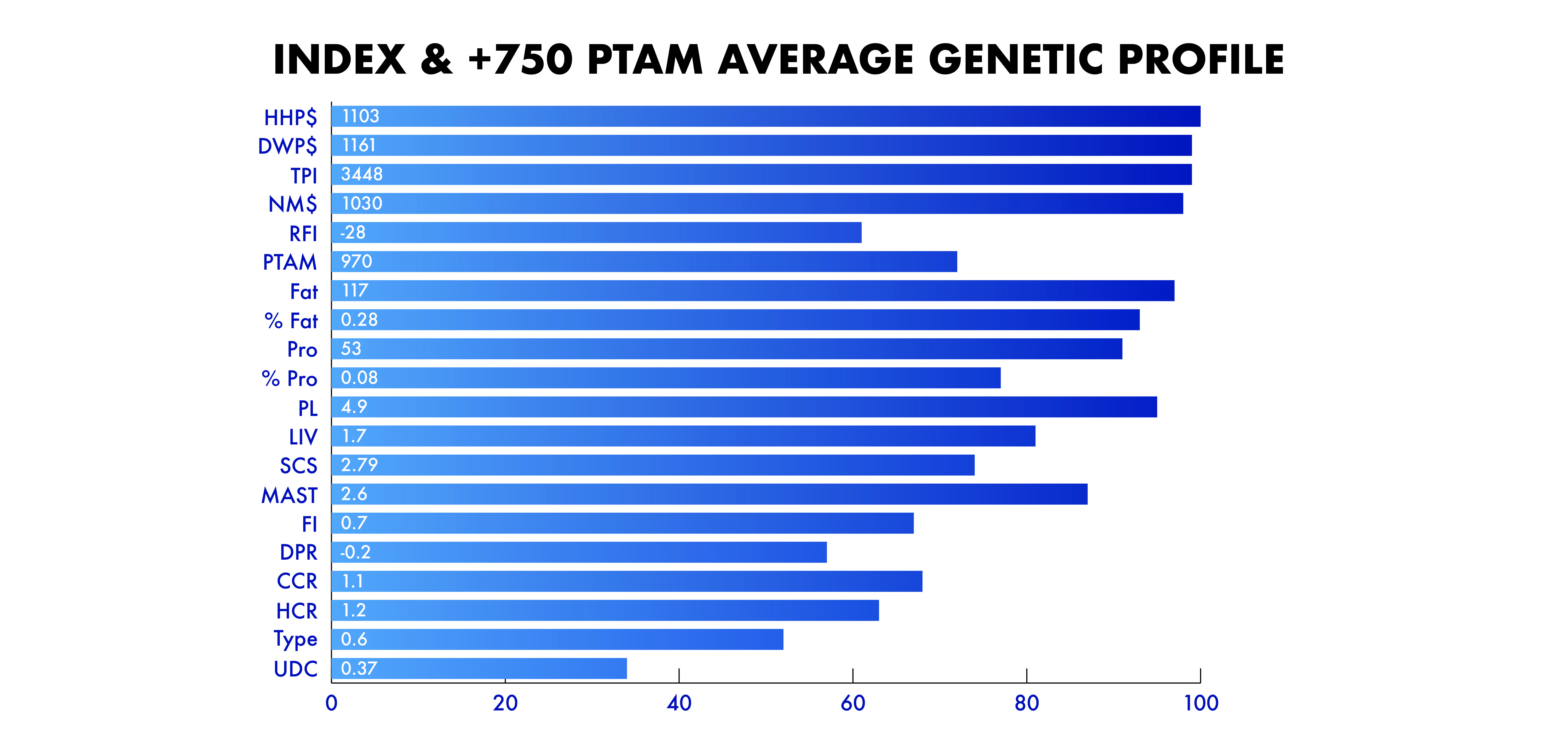 For example, if the +694 PTAM group average of the index-selected bulls falls below the herd’s preferred average, a PTAM cutoff of +750 can be applied as a starting point. This corresponds to the 41st percentile of industry bulls, maintaining a large, workable population while filtering out the lowest-performing sires. In contrast, a +1250 PTAM cutoff, near the 86th percentile, would eliminate most of the population before other traits are even considered.