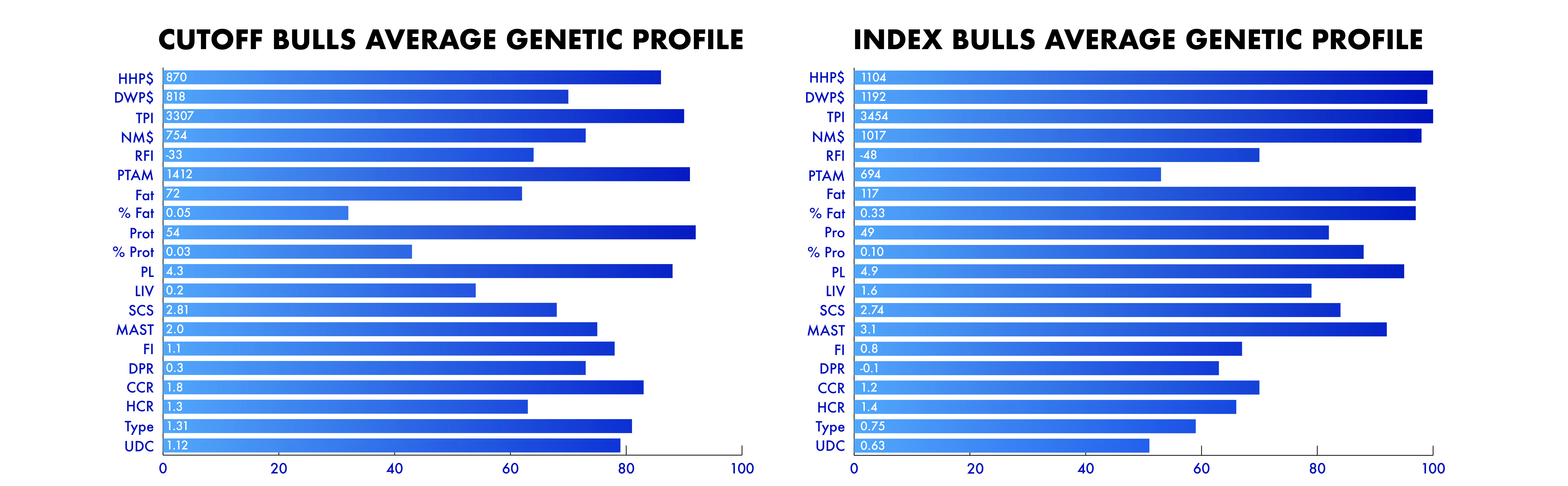 The cutoff-selected bulls excel in the traits targeted by the thresholds (milk, DPR, PTAT, UDC), as expected. However, the index-selected bulls still perform reasonably in those areas and outperform in components, productive life, SCS, and mastitis resistance, all traits closely tied to health, efficiency, and longevity. While milk averages just under +700, the bulls remain in the top 50 percent of industry bulls for milk, the top 63 percent for DPR, and perform near or above average in other key traits, demonstrating balanced overall merit. Index-first selection ensures that bulls are evaluated based on overall lifetime value, not just isolated traits.
